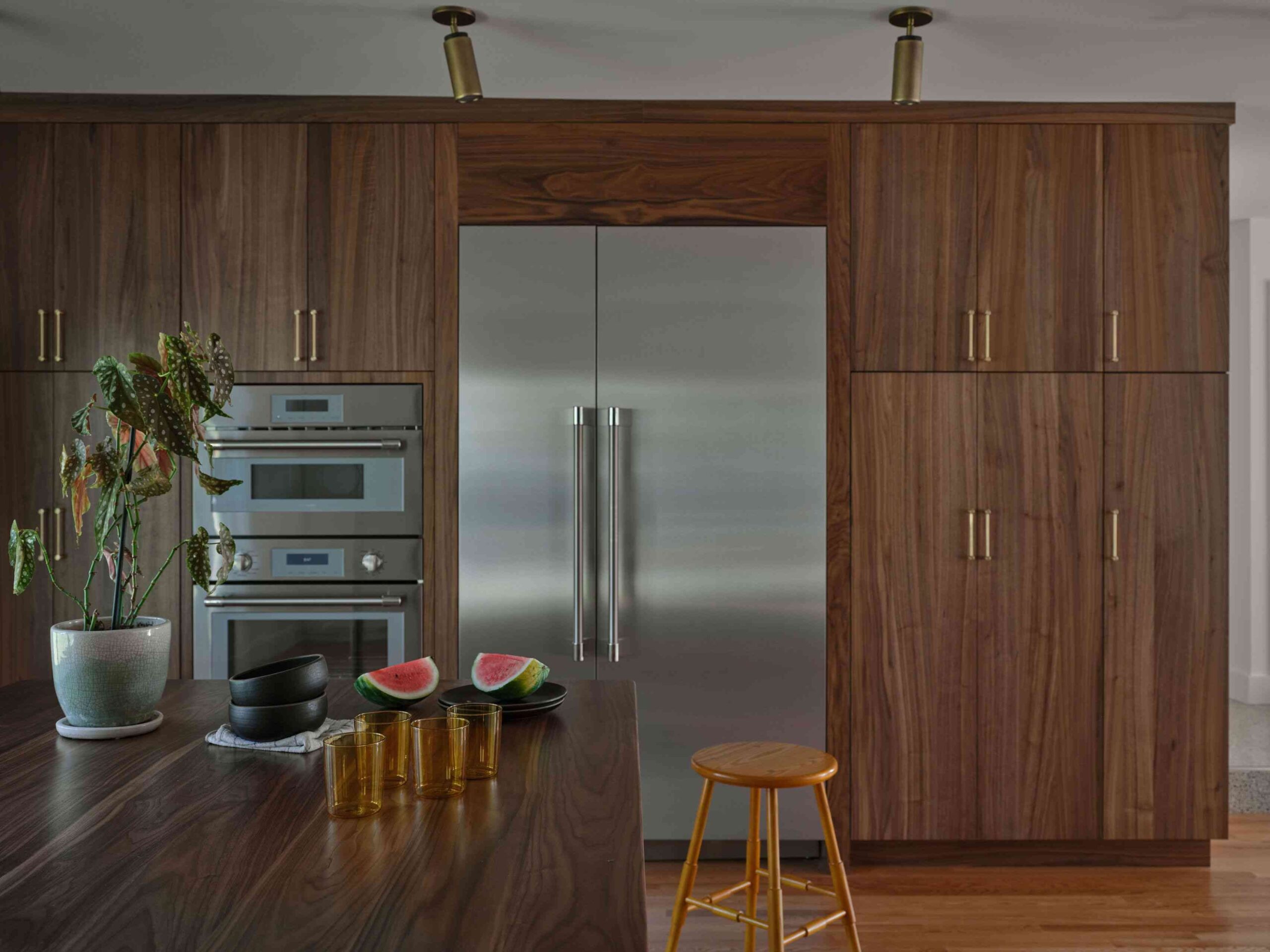 Відхід від повністю білих кухонь поширюється на шафи. Medicus спостерігає зростаючий інтерес до темного дерева та незвичайних кольорів, що відображає прагнення до індивідуальності в домівках. Будь то морений дуб, горіх або темно-синій, бордовий або чорний, ефектні кольори шафи привертають увагу. Це реакція на монотонність кухонь із формочками для печива, які домінували в останніх трендах.
